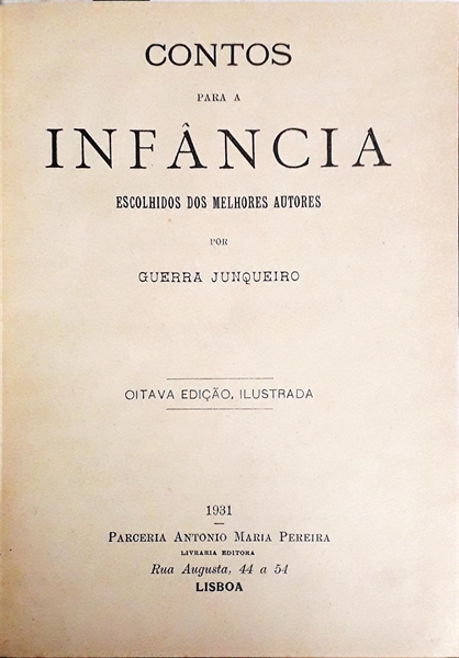Contos para a infância : escohidos dos melhores auctores / compil. Guerra Junqueiro. - Lisboa : Typ. António Maria Pereira, 8 edicao, 1931. Usado com algum desgaste.
