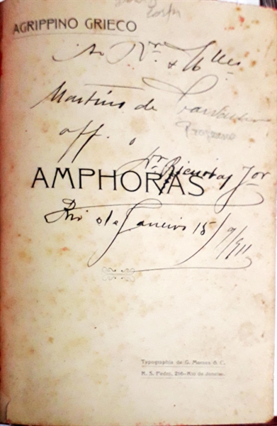 Agrippino Greco. Amphoras. 1ª edição. Rio de Janeiro: Typographia de G. Moraes & C., s.d. 1 Com dedicatória do autor. Usado com desgaste.