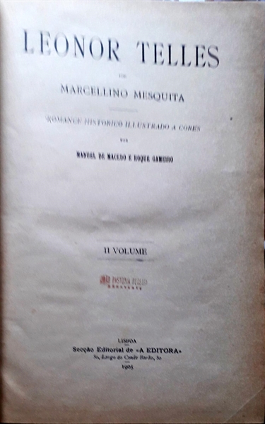 Leonor Telles por Marcellino Mesquita, Romance histórico ilustrado a cores por Manuel de Macedo e Roque Gameiro. Edição: Secção Editorial de «A Editora». 1904-1905. 3 volumes