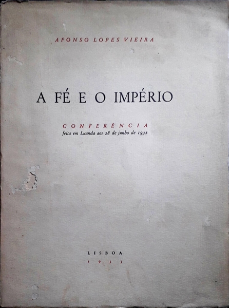 VIEIRA, Afonso Lopes – A FÉ E O IMPÉRIO. Tipografia Inglesa Lda, Lisboa, 1933. In-8.º de 26(2) págs. Br. Exemplar por abrir, com buraco na capa e llalgumas paginas apresentam acidez. Exemplar n 10 de 200.