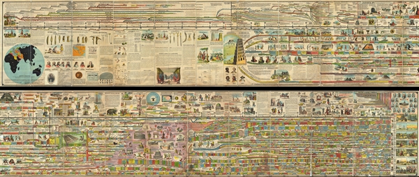 Panorama Ilustrado da História de Adams. este gigantesco diagrama panorâmico mostra a história do mundo a partir de uma perspectiva bíblica, começando com a criação de Adão em 4004 a.C. e terminando em 1878 (embora projetado no futuro até 1900). Adams centraliza seu gráfico no Fluxo do Tempo, dividido em décadas e séculos.segue os begats da Bíblia, e eventualmente segue lentamente para o período histórico com o desenvolvimento da cultura egípcia, persa e grega. Ele observa todos os eventos importantes e oferece comentários históricos e bíblicos quando apropriado - geralmente ilustrando monumentos históricos e eventos e monstruosidades bíblicas. O mapa se torna necessariamente cada vez mais complicado à medida que passa para a era clássica, a era pré-moderna e, finalmente, os tempos modernos. No final do gráfico, Adams mostra os atuais governantes mundiais.