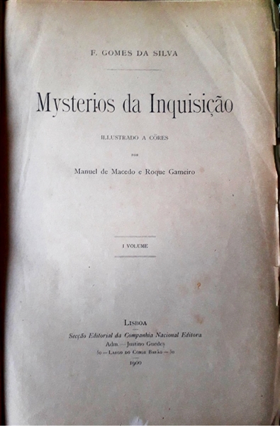 SILVA (F. Gomes da).— MYSTERIOS DA INQUISIÇÃO. Illustrado a côres por Manuel de Macedo e Roque Gameiro. Lisboa. Secção Editorial da Companhia Nacional Editora. 1900-1904. 3 vols. 20x27 cm. E. Algum desgate no primeiro volume.